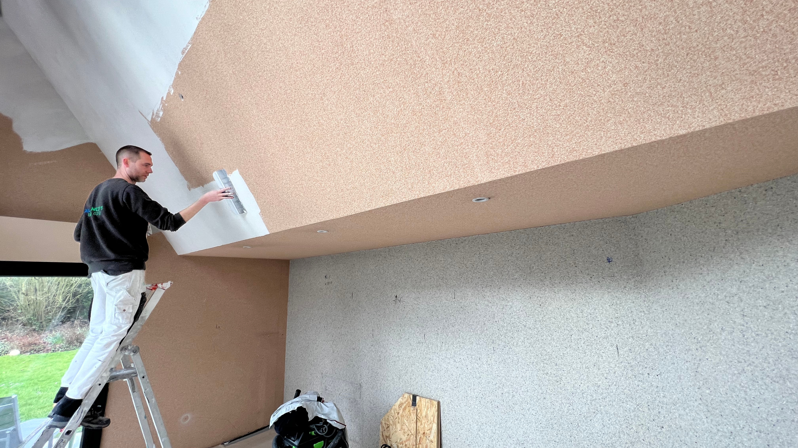 4. Révision d’enduit : Cette phase consiste a examiner attentivement la surface enduite et poncée.Si des irrégularités subsistent,un enduit de finition est appliqué pour corriger les derniers défauts avant la peinture.